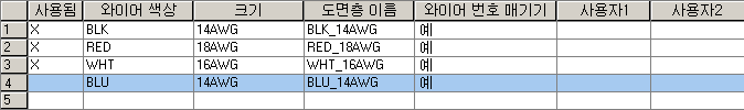 - 와이어 색상 열 내의 빈 행을 클릭하고 와이어 색상으로 BLU를 입력합니다.