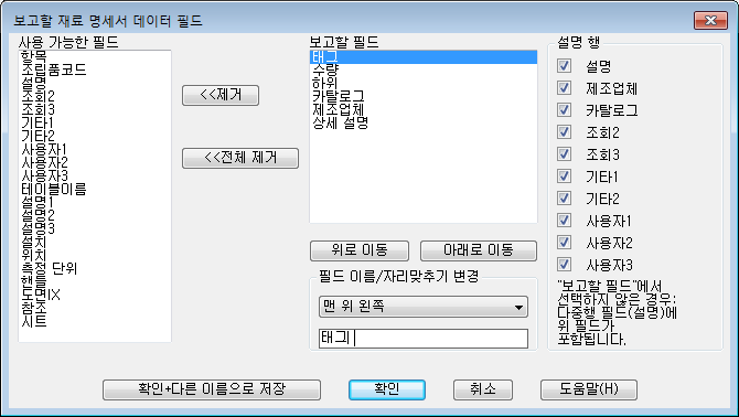 보고할 재료 명세서 데이터 필드 대화상자의 보고할 필드 섹션에 재료 명세서를 형식화하는 필드가 표시됩니다.