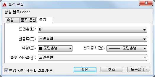 속성이 켜진 도면층을 정의하고 또한 속성의 선에 대한 색상, 선가중치 및 선종류를 정의합니다. 도면이 플롯 스타일을 사용하는 경우, 특성 탭을 사용하여 속성에 플롯 스타일을 지정할 수 있습니다.