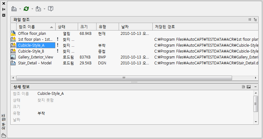 - 상태, 크기 및 작성 날짜 같은 정보를 포함하여 현재 도면의 참조 리스트를 표시합니다.