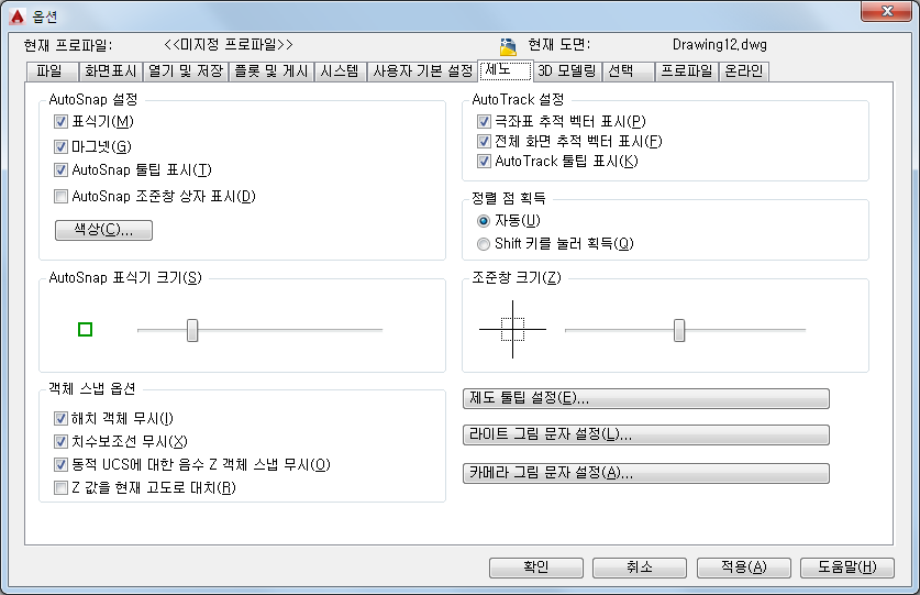 AutoSnap 표식기의 표시를 조정합니다. 이 표식기는 십자선을 스냅점 위로 가져 가면 표시되는 기하학적 기호입니다. (AUTOSNAP 시스템 변수)