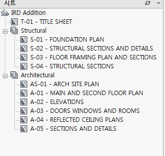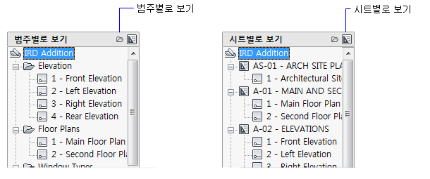 시트 리스트 탭에서 시트를 하위 세트라는 집합으로 정렬할 수 있습니다. 시트 뷰 탭에서 뷰를 범주라는 집합으로 정렬할 수 있습니다.
