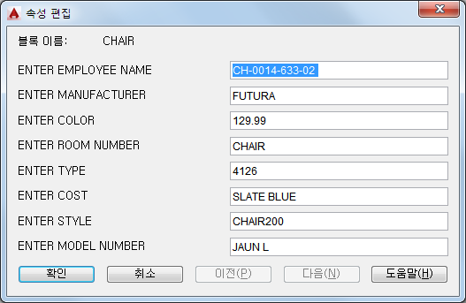 이 대화상자에서는 특정 블록 속성의 값을 변경합니다. 위치, 높이 및 스타일과 같은 속성 특성을 변경하려면 -ATTEDIT를 사용합니다.