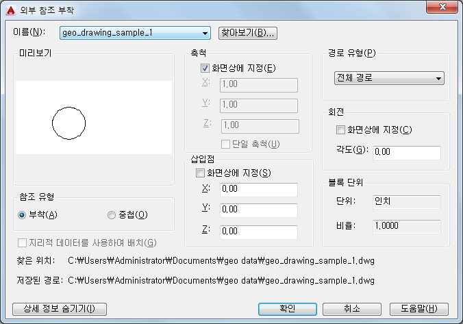 외부 참조를 부착할 때 도면과 함께 저장된 경로를 표시합니다. 경로는 경로 유형 설정에 따라 결정됩니다.
