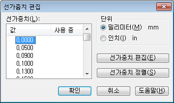 플롯 스타일 테이블의 선가중치를 나열합니다. 기존 선가중치를 수정할 수 있지만 추가하거나 삭제할 수는 없습니다. 선가중치 값을 변경하면 해당 선가중치를 사용하는 다른 플롯 스타일도 변경됩니다.