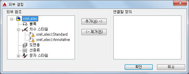 외부 참조 리스트에서 선택한 명명된 객체 정의를 연결할 정의 리스트로 이동합니다.