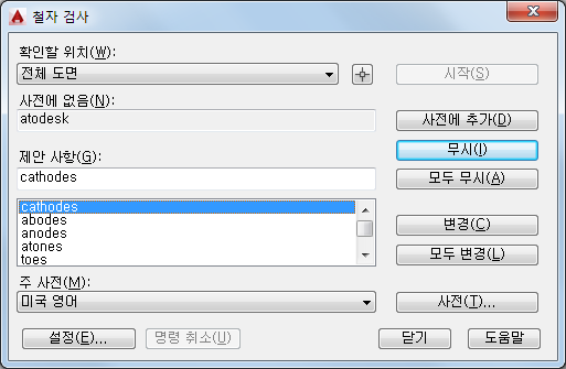 한 줄 문자, 여러 줄 문자, 다중 지시선 문자, 블록 속성의 문자, 외부 참조의 문자 및 치수에 추가된 문자 등에서 철자를 검사합니다.