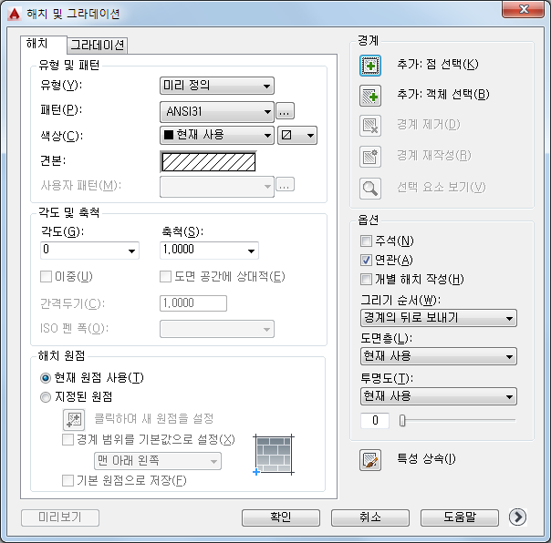 해치 및 그라데이션 대화상자에는 두 개의 탭이 있으며, 두 탭에서 모두 사용 가능한 몇 가지 공통 옵션이 있습니다.