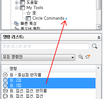명령 리스트 창에서 하위 메뉴에 추가할 명령을