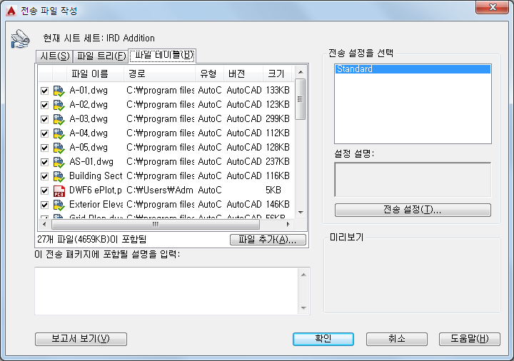 기본적으로 현재 도면과 연관된 모든 파일(예: 관련된 외부 참조, 플롯 스타일 및 글꼴)이 나열됩니다. 전송 패키지에 파일을 추가하거나 기존 파일을 제거할 수 있습니다. URL로 참조된 관련 파일은 전송 패키지에 포함되지 않습니다.