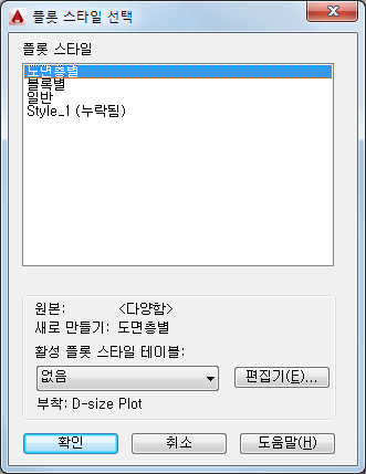 현재 도면에 부착된 플롯 스타일 테이블을 설정합니다. 플롯 스타일 테이블에는 플롯 스타일이 정의되어 있습니다.