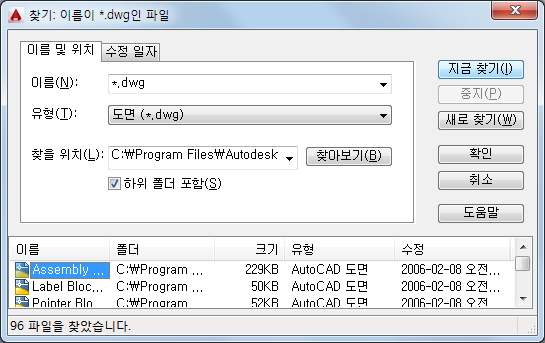 검색에 포함되는 파일 형식은 형식에 의해 결정되므로 이름에 파일 확장자를 입력하지 않아도 됩니다. 예를 들어, house102.dwg를 찾으려면 house*를 입력하고 형식을 도면(*.dwg)으로 설정합니다.