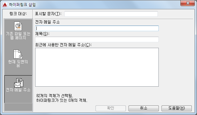 최근에 사용했던 전자 메일 주소를 나열하여 하이퍼링크에 사용할 주소를 선택할 수 있습니다.