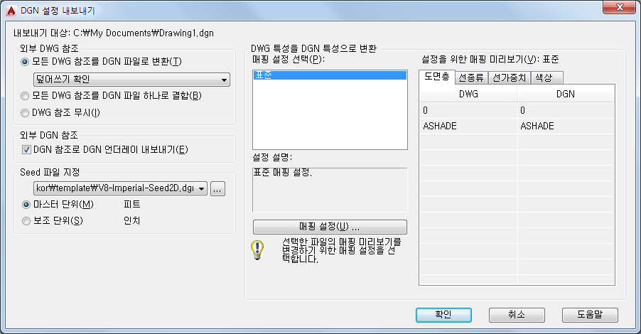 표준은 내보낼 도면에서 데이터를 추출하고, 매핑 미리보기에 표시된 대로 DGN 도면층, 선종류, 선가중치, 색상에 자동 매핑을 적용하는 기본 매핑 설정입니다.