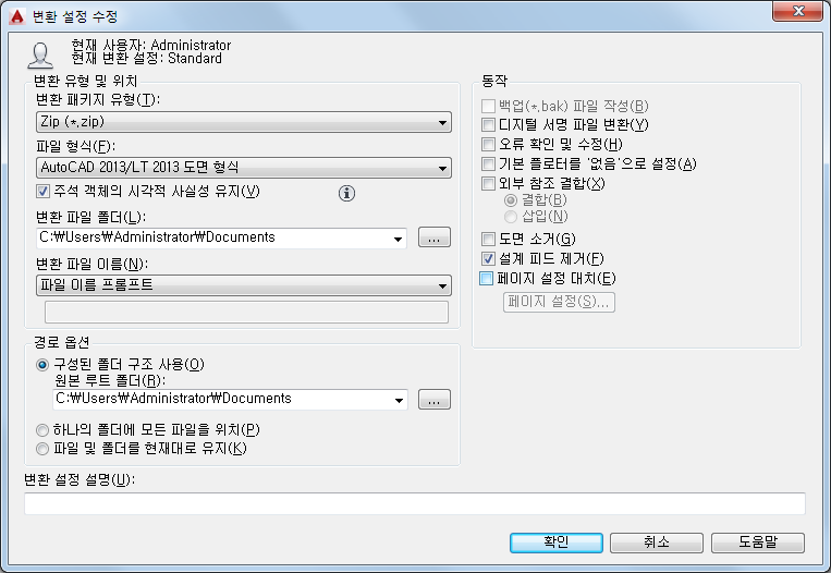 변환 설정에 대한 설명을 입력합니다. 이 설명은 변환 파일 설정 리스트 아래의 변환 설정 대화상자 및 DWG 변환 대화상자에 표시됩니다. 리스트에서 해당 설명을 표시할 임의의 변환 설정을 선택할 수 있습니다.