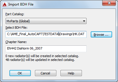 라디에이터 폴더에서 지정된 폴더 이름 아래의 부품이 업데이트됩니다. AutoCAD MEP에서는 BDH 파일에 지정된 하위 장 이름에 따라 부품을 구성하고 기존 라디에이터도 업데이트합니다.