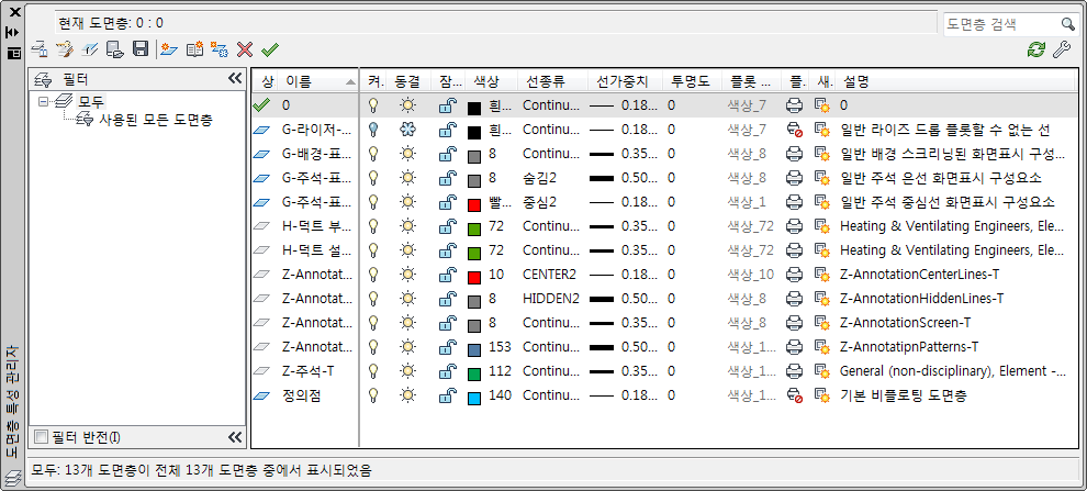 도면층 특성 관리자를 사용하면 현재 도면에서 도면층을 보고 관리할 수 있습니다.