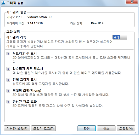 또한 명령행에서 -GRAPHICSCONFIG 명령을 사용하여 더 많은 옵션에 액세스할 수 있습니다. 자세한 내용은 AutoCAD 도움말을 참고하십시오.