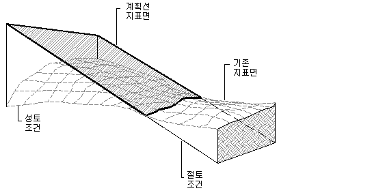 복합토량 방법은 두 지표면 사이의 삼각망 모서리가 걸치는 위치 뿐 아니라 두 지표면의 점을 사용합니다. 절토, 성토 및 순 토량은 두 지표면 사이의 표고 차이에 기초하여 계산됩니다.