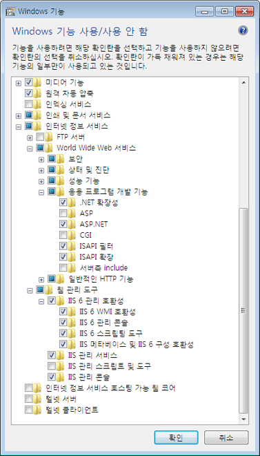 - 인터넷 정보 서비스 ► World Wide Web 서비스 ► 응용프로그램 개발 기능을 차례로 확장합니다.