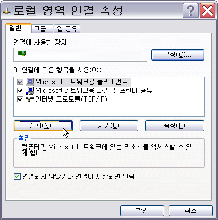 - 로컬 영역 연결 특성 대화상자에서 설치를 클릭합니다.
