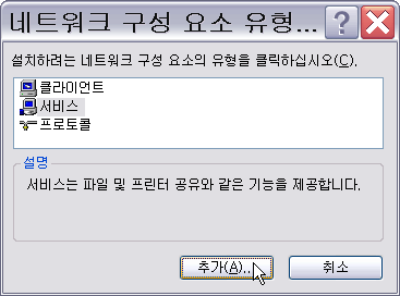 - 네트워크 구성 요소 유형 선택에서 서비스를 선택한 다음 추가를 클릭합니다.