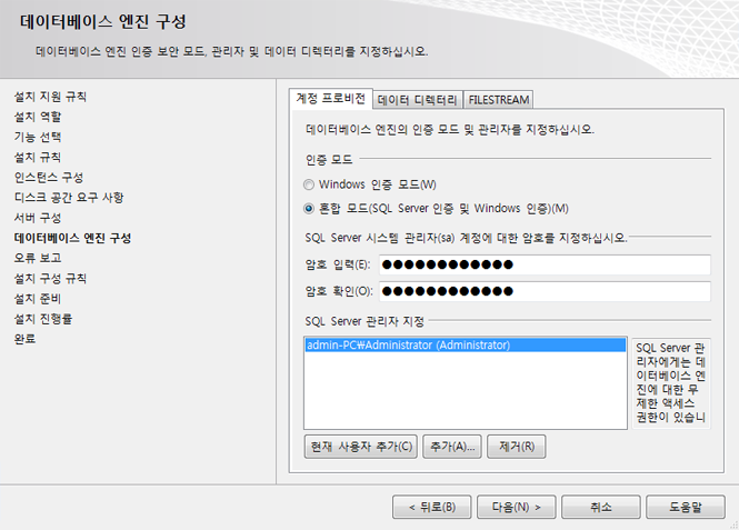 - 로컬 관리자 계정(또는 원하는 계정)을 SQL 서버 관리자로 추가합니다. 이 대화상자에 입력한 Windows 사용자만 SQL 서버에 로그인할 때 모든 권한을 갖게 됩니다. 다른 모든 Windows 로그인은 게스트 계정으로 취급됩니다.