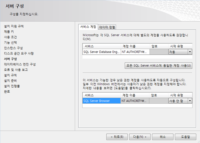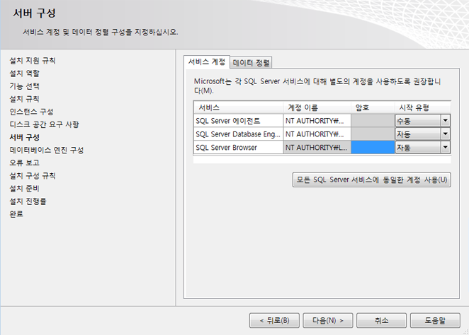 - SQL 서버 데이터베이스 엔진에 대해 NT AUTHORITY₩NETWORK SERVICE 계정을 지정합니다. 로컬 시스템 계정도 사용할 수 있습니다. 원격 위치에 대해 백업 및 복원을 수행하려는 경우 도메인 사용자 계정을 지정합니다. 시작 유형을 자동으로 설정합니다.