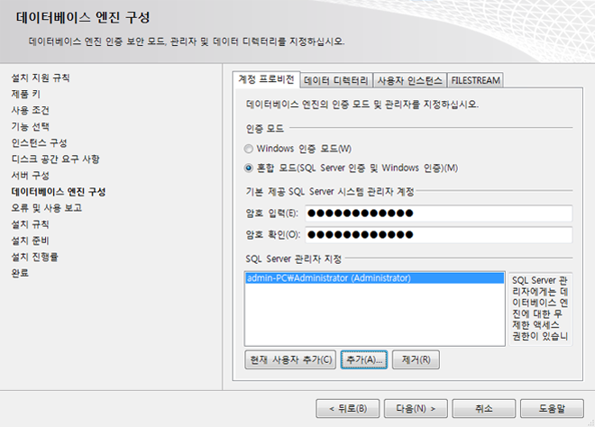 - 데이터베이스 엔진을 구성 창에서 계정 프로비전 탭을 선택합니다.
