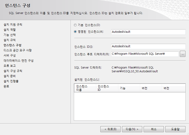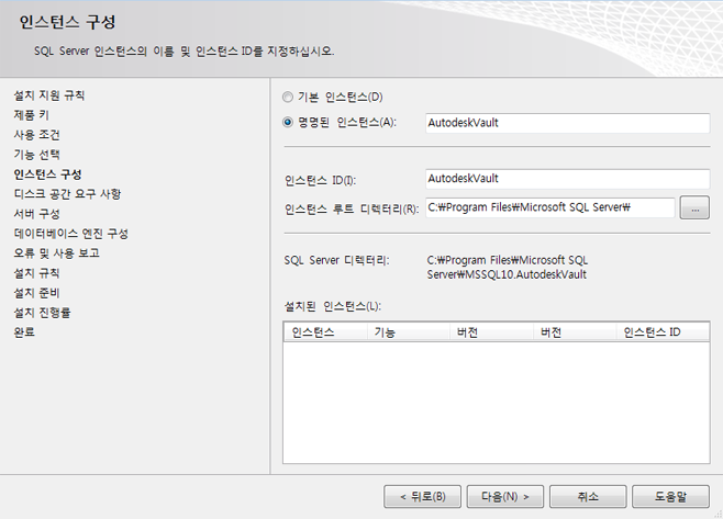 주: 이 인스턴스 이름을 지정하지 않고 SQL을 설치하면 Autodesk Vault Server 설치 중에 Microsoft SQL Express 2008 SP2를 사용하여 AutodeskVault라는 고유한 SQL 서버 인스턴스가 작성됩니다. 이름이 AutodeskVault가 아닌 SQL 인스턴스는 인식되지 않습니다.