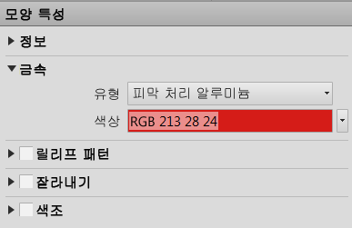 재질 정의에는 여러 특성 측면이 지정되어 있습니다. Inventor에서는 모양 특성과 물리적 특성이라는 두 가지 특성 세트가 사용되는데, 각 세트에는 재질 정의에 영향을 주는 특정 특성이 있습니다.