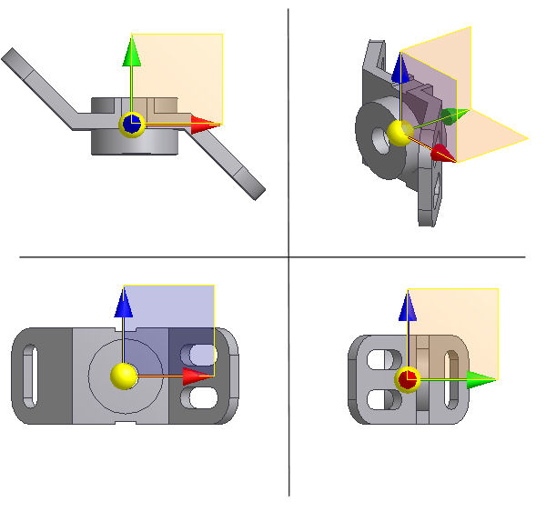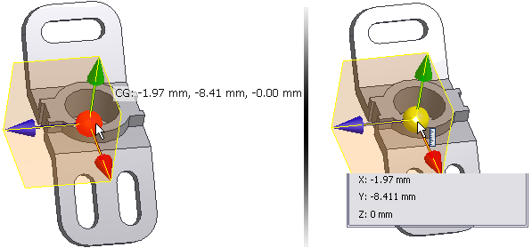 무게 중심(COG) 트라이어드의 기호 원점에는 선택 가능한 한 개의 구, 선택 가능한 세 개의 작업 평면 및 선택 가능한 한 개의 작업점이 포함되어 있습니다. COG 작업 형상은 거리 및 각도 측정 및 "보기" 뷰 선택에 사용됩니다. 구 및 구 중심의 작업점에는 선택한 부품의 무게 중심 위치가 표시됩니다. 기호는 무게 중심을 특정 영역 내에 유지하기 위해 설계 작업 동안 가시적 참조로 제공되기도 합니다.