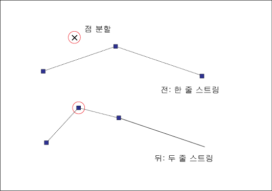 선 처리의 예: 선을 분할하면 두 개의 선 피쳐가 작성됩니다.