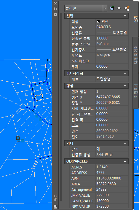 선택한 폴리선에 따라 다른 정보가 표시될 수 있습니다.