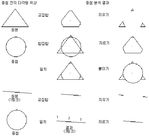 지우기 연산은 중첩 폴리곤 위상을 마스크처럼 사용하여 중첩 위상이 덮고 있는 원시 폴리곤 위상의 모든 것을 지웁니다.