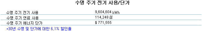 을 검토할 경우 이 표에는 30년으로 가정된 건물 수명을 초과하여 예측한 에너지 사용 및 단가가 요약됩니다.