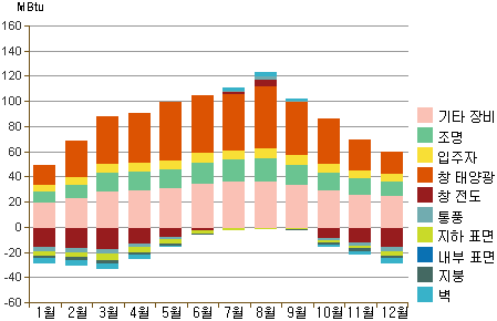 예: 위의 샘플 차트에서는 8월에 가장 큰 누적 냉방 부하가 발생합니다. 창 태양광 또는 창을 통한 복사 태양열 증가가 가장 큰 원인입니다. 그러나 벽을 통한 열 증가는 비교적 미미합니다. 따라서 벽 단열재 값을 개선하고자 투자하기 전에 창의 일사열 취득 계수를 줄여 유리 성능을 개선해야 합니다.