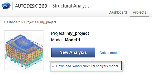 The Robot Structural Analysis engine performs analyses in the cloud. You can download an Robot Structural Analysis model with or without results from the Autodesk® 360 Structural Analysis website.