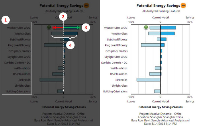 4: 민감도. 막대의 전체 크기는 이 건물 요소에 대한 에너지 해석의 민감도를 나타냅니다. 이 막대가 크면 이 요소를 변경할 경우 에너지 사용에 상당한 영향을 미칠 수 있습니다. 또한 막대 크기는 대체 실행에서 이 요소 값이 변경되는 크기에 의해 결정됩니다. 극한 값을 나타내는 실행이 선택되었습니다.