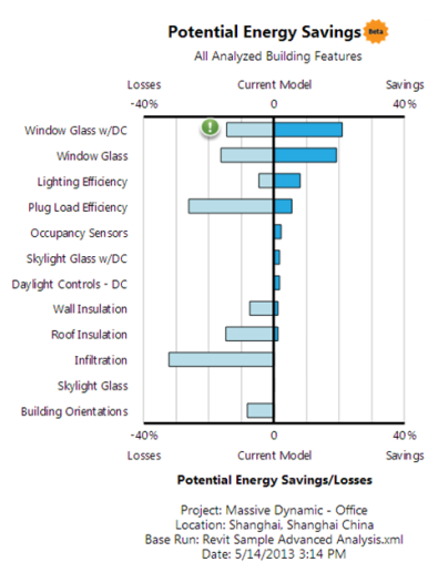 3: 절약/손실 가능성. 에너지 절약 가능성이 가장 높은 요소가 리스트의 맨 위에 있습니다. 중심선의 오른쪽에 있는 막대 크기는 현재 모델에 기반한 잠재적인 절약 비율입니다. 중심선의 왼쪽에 있는 막대 크기는 잠재적인 손실 비율입니다.