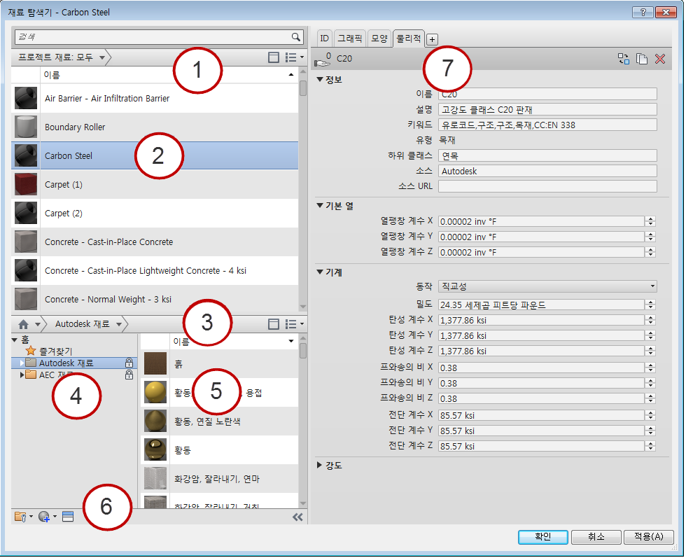 5 | 라이브러리 재료 리스트: 라이브러리 리스트에서 선택된 라이브러리 또는 카테고리(클래스)의 재료를 표시합니다. |