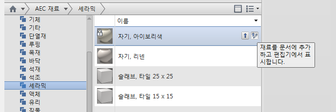 - 라이브러리 재료 리스트에서 재료를 클릭한 다음 추가-편집