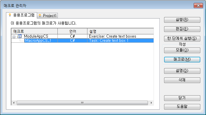 - 매크로 관리자에서 응용프로그램 레벨 매크로의 경우 응용프로그램 탭을, 문서 레벨 매크로의 경우 프로젝트 탭을 선택합니다.
