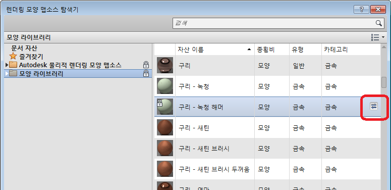 팁: 렌더링 모양 맵소스 탐색기에서 렌더링 모양 맵소스를 보다 쉽게 찾으려면 열 머리글 중 하나를 클릭하여 렌더링 모양 맵소스 이름, 외관, 유형 또는 카테고리를 기준으로 정렬합니다. 또한 렌더링 모양 맵소스 리스트 위에 있는 검색 막대를 사용할 수 있습니다.