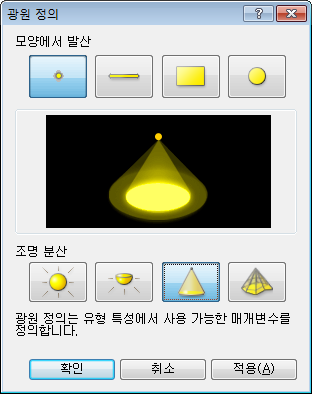 - 모양에서 발산에 대해 광원에서 발산되는 빛의 모양을 점, 선, 직사각형 또는 원 중에서 선택합니다.