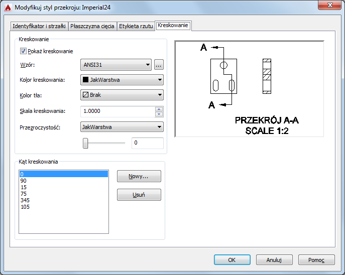Ustala listę kątów do wykorzystania przez kreskowania w przekroju. Pierwszy komponent w przekroju korzysta z pierwszej pozycji na liście, drugi komponent z drugiej itd. Na liście musi znajdować się co najmniej jeden kąt.
