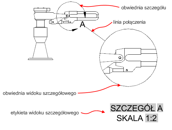 W przypadku zmiany skali rzutu macierzystego obwiednia szczegółu również jest przeskalowywana. Rozmiary identyfikatora i grotu strzałki pozostają niezmienione. Są one określane przez ustawienia stylu szczegółu.
