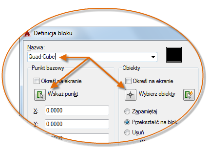 Zamiast tworzenia nowego pliku rysunku, który ma zostać wstawiony jako blok, można utworzyć definicję bloku bezpośrednio w bieżącym rysunku. Tej metody należy użyć, jeśli nie planuje się wstawiania bloku do innego rysunku. W takim przypadku należy użyć polecenia BLOK, aby utworzyć definicję bloku.