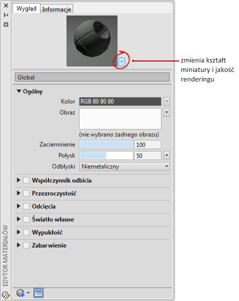 Edytuj istniejący materiał (dostępny w bibliotece Autodesk Material Library) lub rozpocznij od materiału ogólnego. Wprowadzane zmiany są wyświetlane w podglądzie próbki materiału. Można zmienić kształt obrazu wyświetlanego w podglądzie.