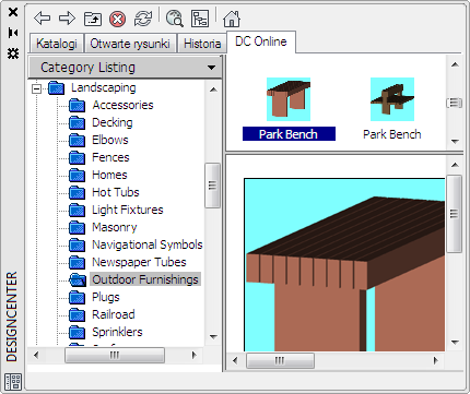Aby uzyskać dostęp do DesignCenter Online, wybierz kartę DC Online w oknie DesignCenter. Po otwarciu okna DesignCenter Online można przeglądać, wyszukiwać i pobierać potrzebne zasoby.